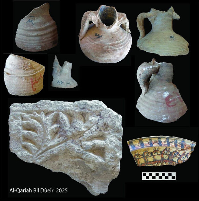 Еще среди найденных артефактов — амфоры с надписями (клеймами), которые могут указывать на их содержимое или принадлежность, черепки глиняных сосудов (остраки, или остраконы) с коптскими письменами, предметы обихода и известняковые плиты с коптскими надписями, возможно, с мемориальных стел или надгробий.